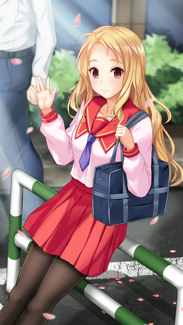 桜の舞う街の一角でこちらに気づいて手を振ってくれています。